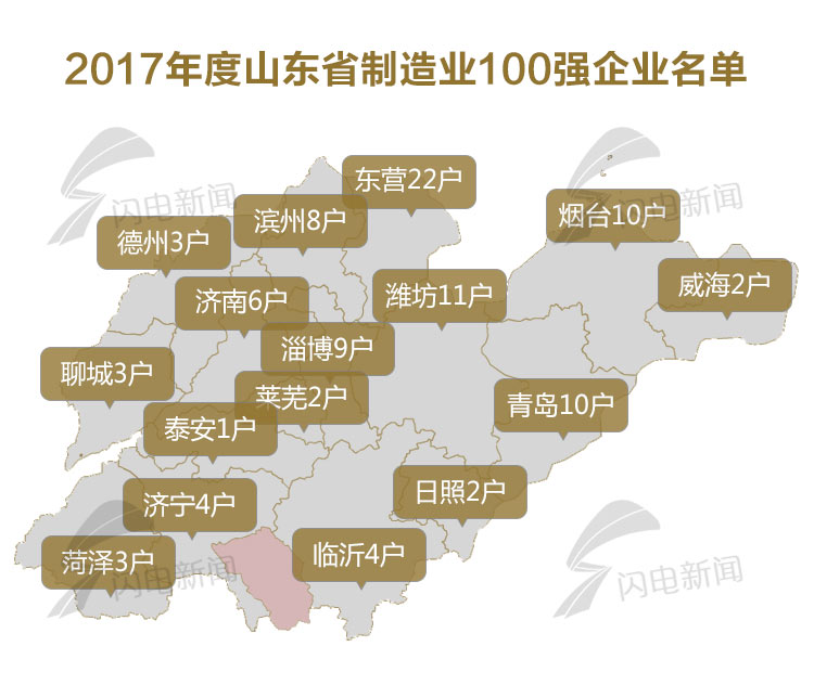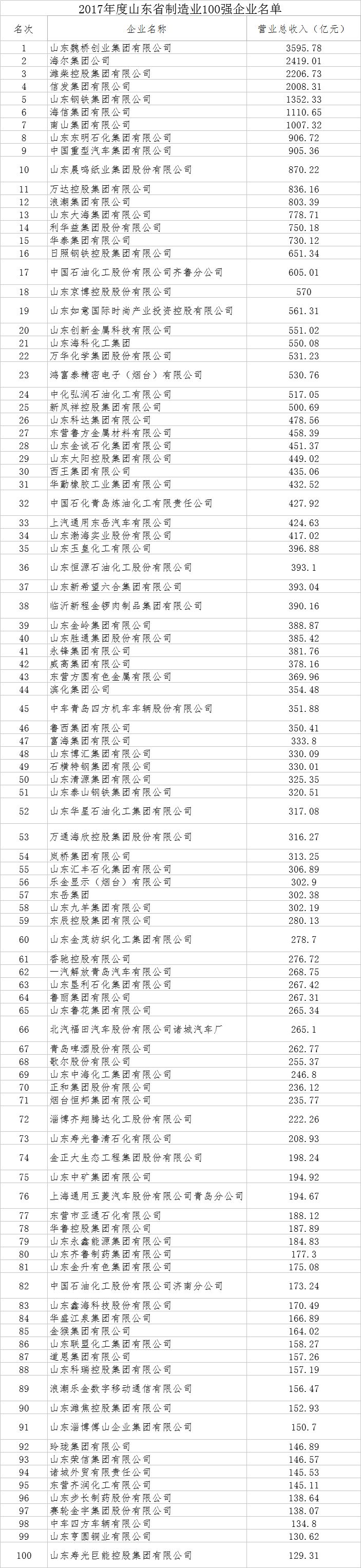 山东省经济和信息化委员会、山东省统计局、山东省企业联合会依据企业2017年营业收入统计年报数据(企业集团为合并报表数据),确定了2017年度山东省100强企业、2017年度山东省工业100强企业、2017年度山东省制造业100强企业,7月16日予以公布。