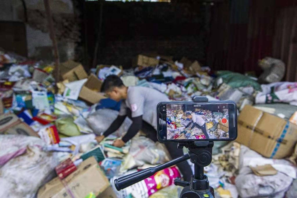 刘阿楠在拍摄自己“废品中寻宝”的短视频。(李树锋 摄)
