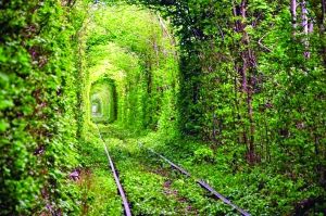 “爱情隧道”位于乌克兰东部克莱文镇。这个三公里长的“绿色隧道”是私营铁路线的一部分,为镇子附近的一家纤维板厂服务,火车每天往返三次运送木材。每当春天来临,铁轨两边的树木枝繁叶茂,浓密的绿色植物枝蔓相连,搭成天然的拱形长廊,将繁忙的铁轨化身为“爱情隧道”。