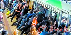 澳大利亚一名男子6日搭乘地铁,不慎一脚踩入列车与站台之间的缝隙,被卡得动弹不得。在场乘客一齐出力,推动重达1万吨的列车朝一侧倾斜,使那人得以拔足而获救。