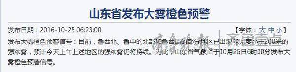 山东省气象台于10月25日6时00分发布大雾橙色预警信号:目前,鲁西北、鲁中的北部和鲁西南的部分地区已出现能见度小于200米的强浓雾,预计今天上午上述地区的强浓雾仍将持续。